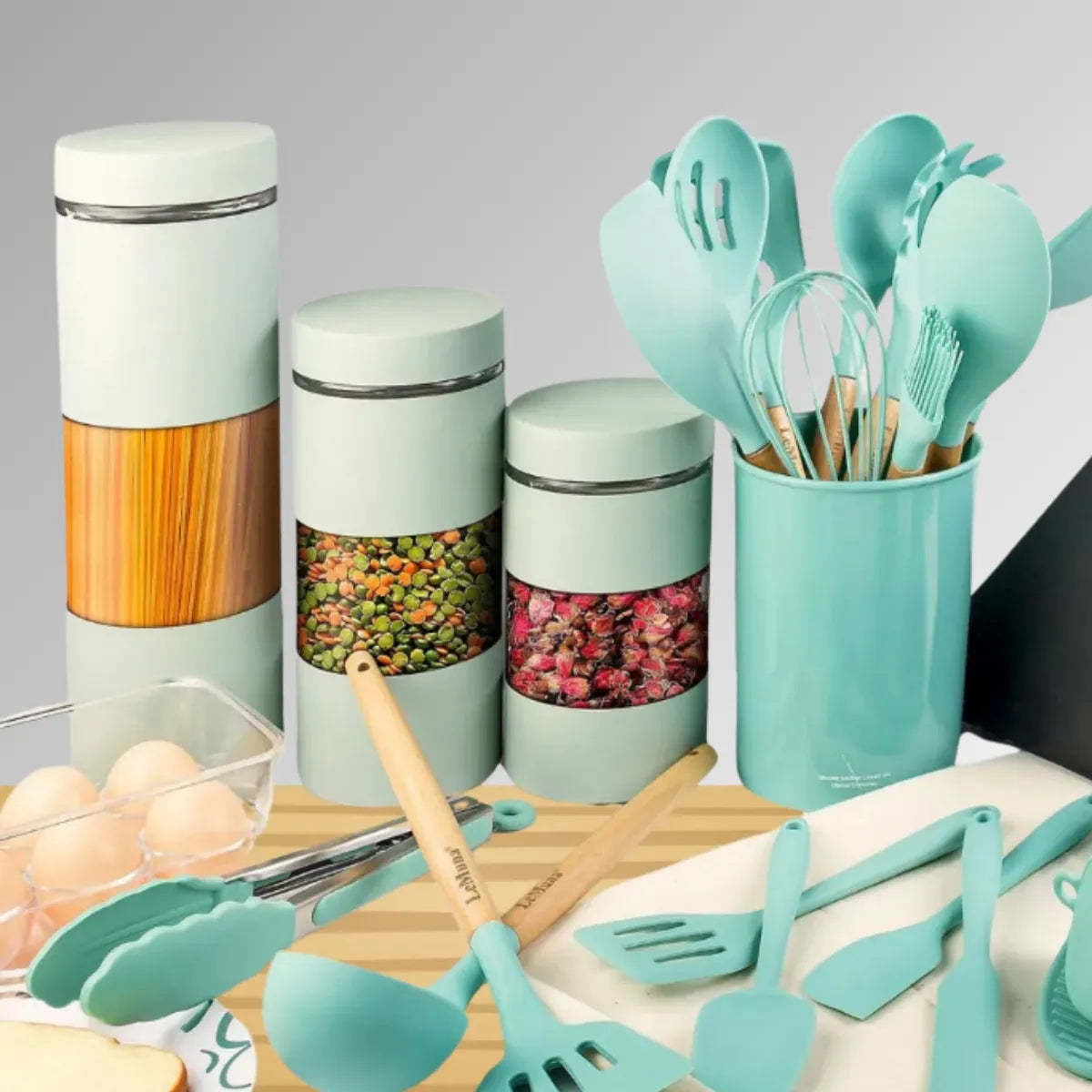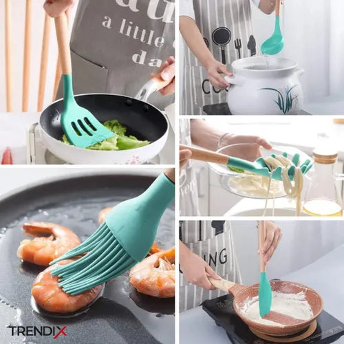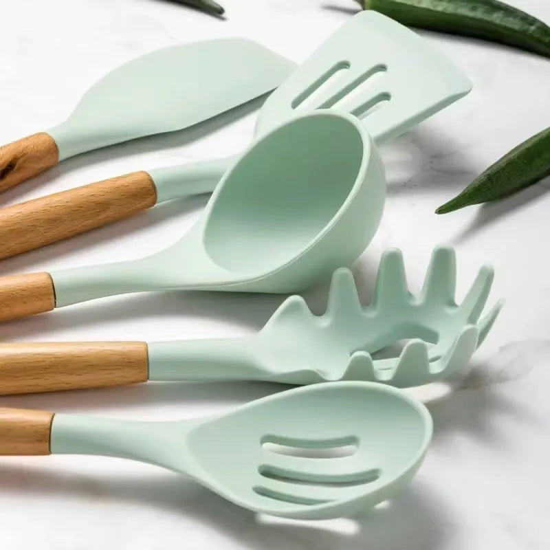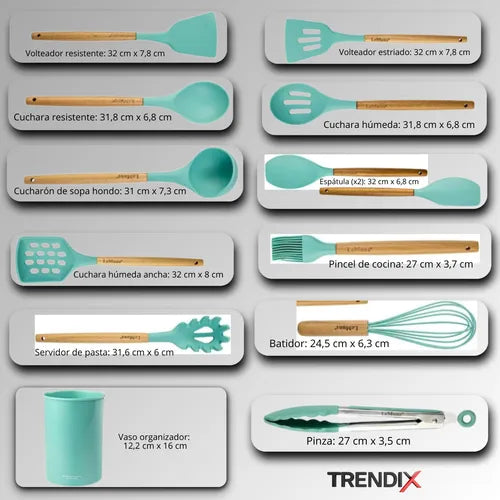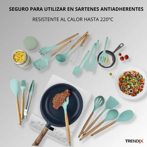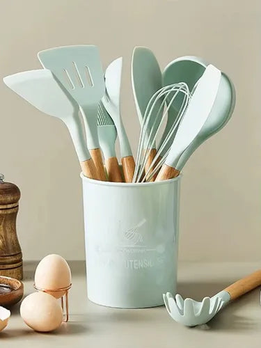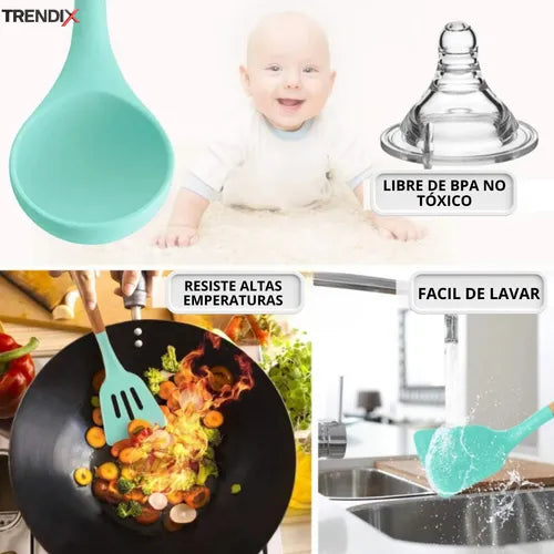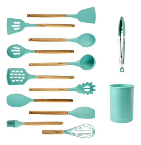 Dale un toque de elegancia y practicidad a tu cocina con nuestro Kit de Utensilios de Cocina Verde Claro, diseñado para destacar en cualquier hogar.